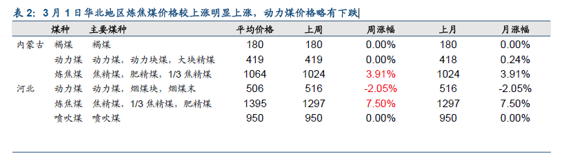 3 月1 日華北地區(qū)煉焦煤價格較上漲明顯上漲,動力煤價格略有下跌